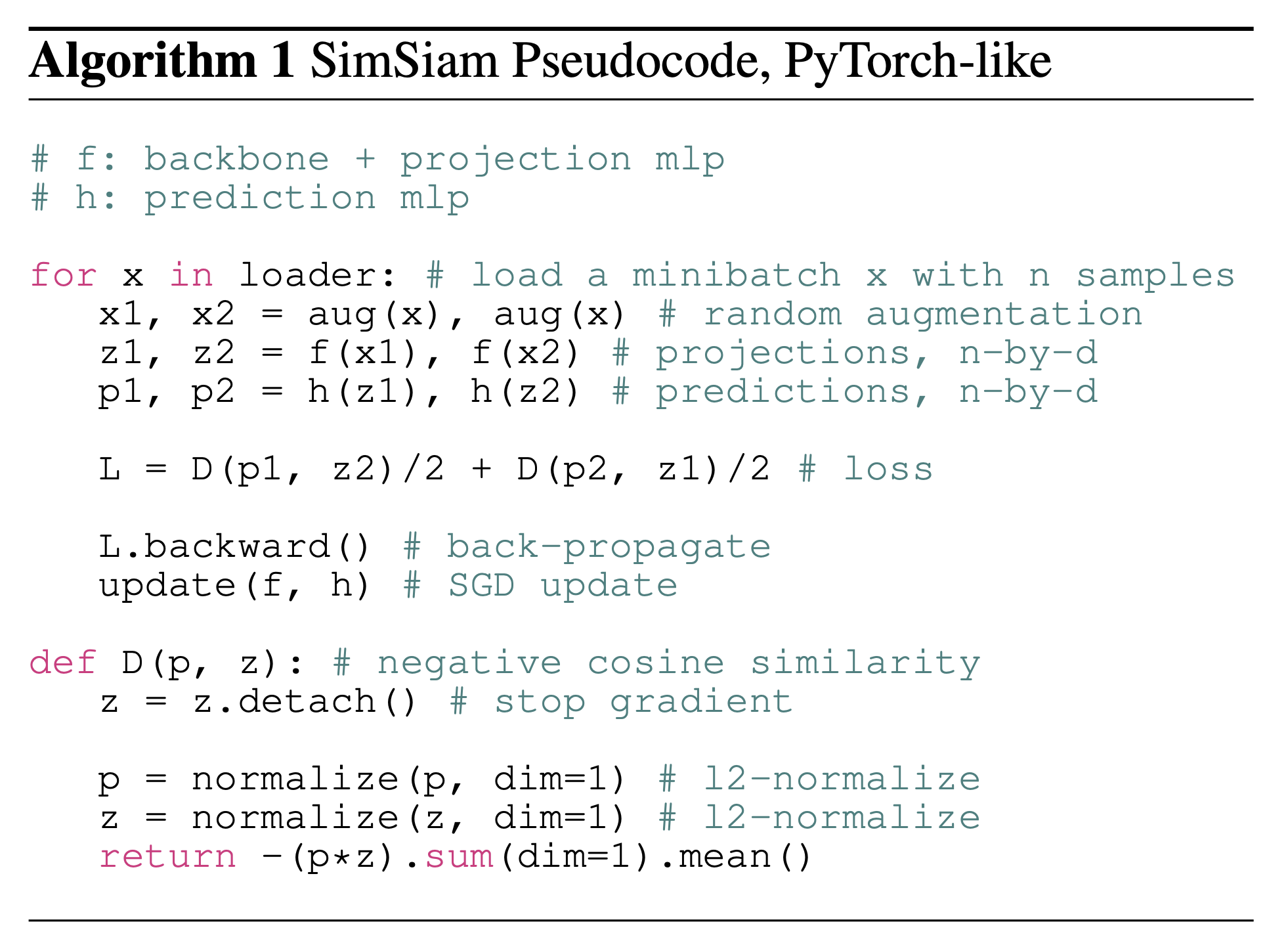 Siamese networks have become a common structure in various recent models for unsupervised visual representation learning. These models maximize the similarity between two augmentations of one image, subject to certain conditions for avoiding collapsing solutions. In this paper, we report surprising empirical results that simple Siamese networks can learn meaningful representations even using none of the following: (i) negative sample pairs, (ii) large batches, (iii) momentum encoders. Our experiments show that collapsing solutions do exist for the loss and structure, but a stop-gradient operation plays an essential role in preventing collapsing. We provide a hypothesis on the implication of stop-gradient, and further show proof-of-concept experiments verifying it. Our “SimSiam” method achieves competitive results on ImageNet and downstream tasks. We hope this simple baseline will motivate people to rethink the roles of Siamese architectures for unsupervised representation learning. Code will be made available.