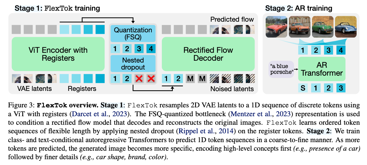 Image tokenization has enabled major advances in autoregressive image generation by providing compressed, discrete representations that are more efficient to process than raw pixels. While traditional approaches use 2D grid tokenization, recent methods like TiTok have shown that 1D tokenization can achieve high generation quality by eliminating grid redundancies. However, these methods typically use a fixed number of tokens and thus cannot adapt to an image’s inherent complexity. We introduce FlexTok, a tokenizer that projects 2D images into variable-length, ordered 1D token sequences. For example, a 256x256 image can be resampled into anywhere from 1 to 256 discrete tokens, hierarchically and semantically compressing its information. By training a rectified flow model as the decoder and using nested dropout, FlexTok produces plausible reconstructions regardless of the chosen token sequence length. We evaluate our approach in an autoregressive generation setting using a simple GPT-style Transformer. On ImageNet, this approach achieves an FID<2 across 8 to 128 tokens, outperforming TiTok and matching state-of-the-art methods with far fewer tokens. We further extend the model to support to text-conditioned image generation and examine how FlexTok relates to traditional 2D tokenization. A key finding is that FlexTok enables next-token prediction to describe images in a coarse-to-fine “visual vocabulary”, and that the number of tokens to generate depends on the complexity of the generation task.