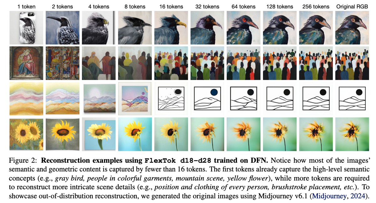 By applying a nested dropout, information is front-loaded: Earlier tokens capture most of the information and thus, with just a few tokens you can reconstruct a semantically similar image. Later tokens add more detail.
