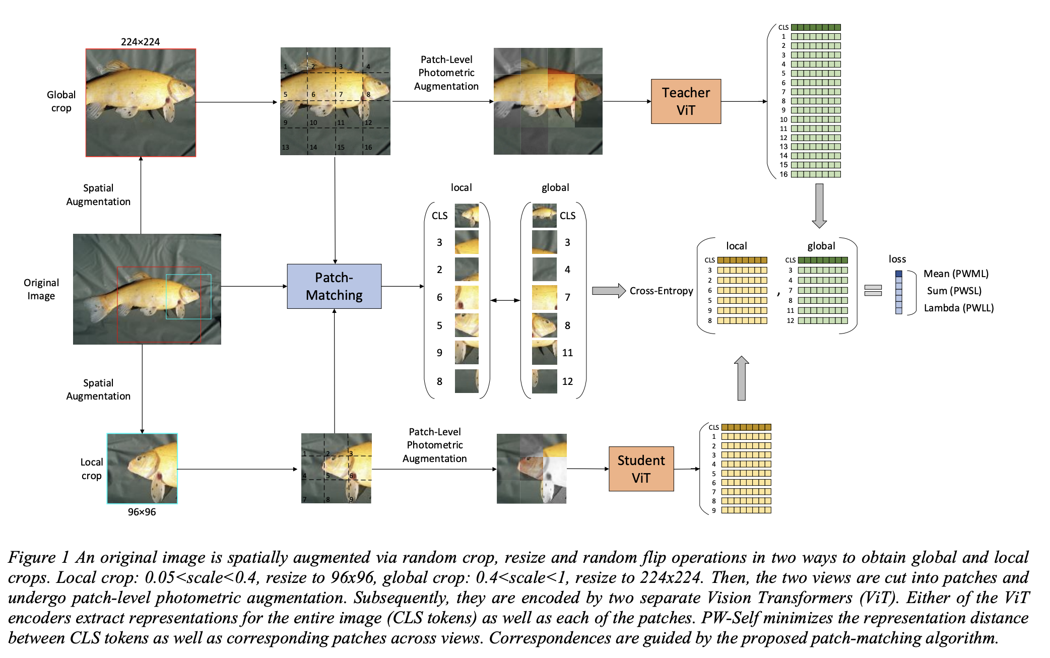 Self-supervised visual representation learning traditionally focuses on image-level instance discrimination. Our study introduces an innovative, fine-grained dimension by integrating patch-level discrimination into these methodologies. This integration allows for the simultaneous analysis of local and global visual features, thereby enriching the quality of the learned representations. Initially, the original images undergo spatial augmentation. Subsequently, we employ a distinctive photometric patch-level augmentation, where each patch is individually augmented, independent from other patches within the same view. This approach generates a diverse training dataset with distinct color variations in each segment. The augmented images are then processed through a self-distillation learning framework, utilizing the Vision Transformer (ViT) as its backbone. The proposed method minimizes the representation distances across both image and patch levels to capture details from macro to micro perspectives. To this end, we present a simple yet effective patch-matching algorithm to find the corresponding patches across the augmented views. Thanks to the efficient structure of the patch-matching algorithm, our method reduces computational complexity compared to similar approaches. Consequently, we achieve an advanced understanding of the model without adding significant computational requirements. We have extensively pretrained our method on datasets of varied scales, such as Cifar10, ImageNet-100, and ImageNet-1K. It demonstrates superior performance over state-of-the-art self-supervised representation learning methods in image classification and downstream tasks, such as copy detection and image retrieval. The implementation of our method is accessible on GitHub.