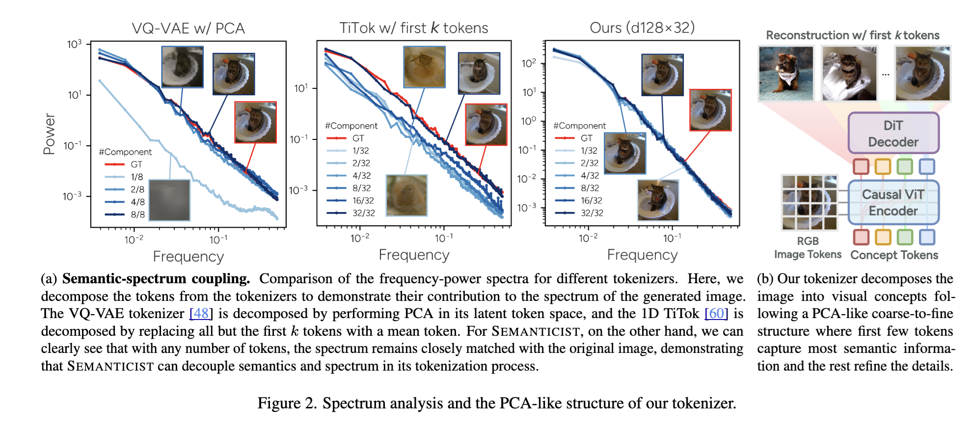 We introduce a novel visual tokenization framework that embeds a provable PCA-like structure into the latent token space. While existing visual tokenizers primarily optimize for reconstruction fidelity, they often neglect the structural properties of the latent space — a critical factor for both interpretability and downstream tasks. Our method generates a 1D causal token sequence for images, where each successive token contributes non-overlapping information with mathematically guaranteed decreasing explained variance, analogous to principal component analysis. This structural constraint ensures the tokenizer extracts the most salient visual features first, with each subsequent token adding diminishing yet complementary information. Additionally, we identified and resolved a semantic-spectrum coupling effect that causes the unwanted entanglement of high-level semantic content and low-level spectral details in the tokens by leveraging a diffusion decoder. Experiments demonstrate that our approach achieves state-of-the-art reconstruction performance and enables better interpretability to align with the human vision system. Moreover, auto-regressive models trained on our token sequences achieve performance comparable to current state-of-the-art methods while requiring fewer tokens for training and inference.