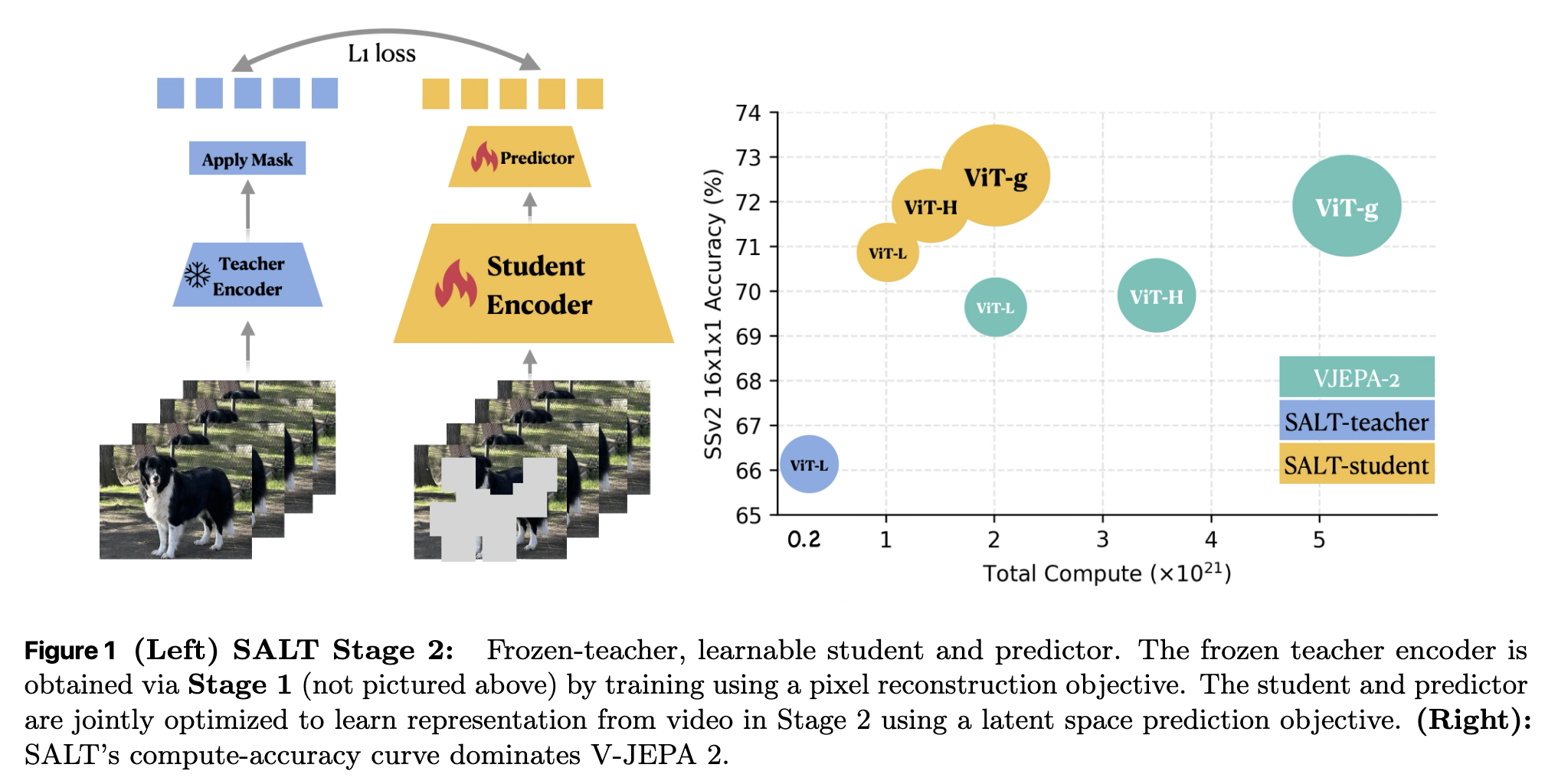 Video Joint Embedding Predictive Architectures (V-JEPA) learn generalizable off-the-shelf video representation by predicting masked regions in latent space with an exponential moving average (EMA)-updated teacher. While EMA prevents representation collapse, it complicates scalable model selection and couples teacher and student architectures. We revisit masked-latent prediction and show that a frozen teacher suffices. Concretely, we (i) train a target encoder with a simple pixel-reconstruction objective under V-JEPA masking, then (ii) freeze it and train a student to predict the teacher’s latents on masked regions. This leads to a two-stage, unregularized scheme that we refer to as SALT (Static-teacher Asymmetric Latent Training). SALT decouples optimization into pixel reconstruction (teacher) and masked latent prediction (student), increasing transparency, efficiency, and scalability while preserving the ability of representation to generalize under frozen evaluation. Empirically, our student models outperform recently proposed V-JEPA 2 encoders under frozen backbone evaluation across diverse benchmarks. They are also more compute-optimal: at matched pretraining FLOPs, our method achieves higher probing accuracy, and its scaling curves dominate V-JEPA’s accuracy-FLOPs Pareto frontier. Finally, we find that student quality is remarkably robust to teacher quality: high-performing students emerge even with small, sub-optimal teachers. This points to a compute budget allocation that should overwhelmingly favor the student. These results position SALT as a simple, scalable, and compute-efficient alternative to EMA-based self-distillation for video representation learning.